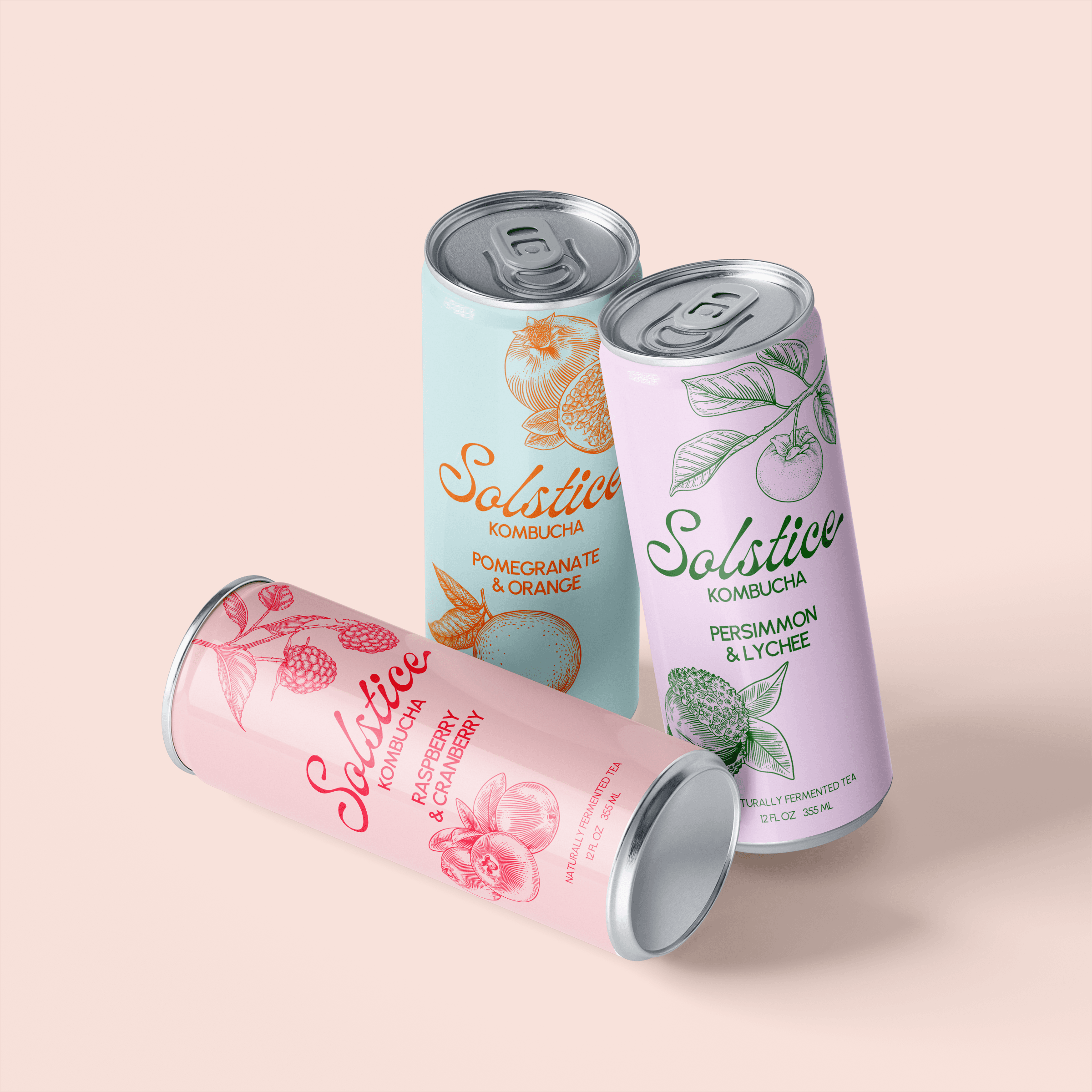 Brand identity and packaging design for Solstice, a new kombucha brand built around all-natural ingredients and unexpected flavor pairings. The creative challenge was desiging a visual language that could tell you at a glance about what you can expect inside of the can. The result is an identity that feels fresh and intentional, with a design system flexible enough to differentiate each unique flavor while keeping the full lineup unmistakably cohesive.